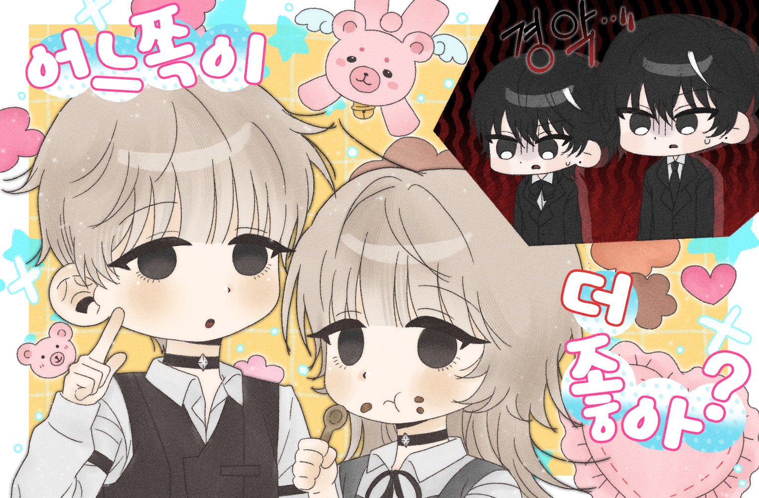 관계: 둘이 사귐. 근데 남캐는 여캐 싫어함. 여캐는 남캐 좋아함. (지랄예민내가최고야가스라이팅남자와 ㅇㅅㅇ?맹한최강여자)